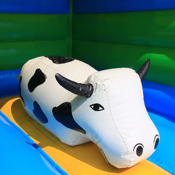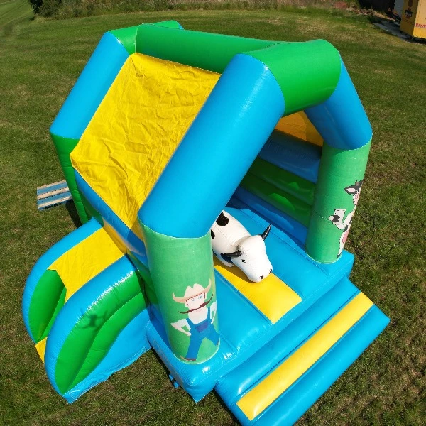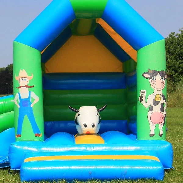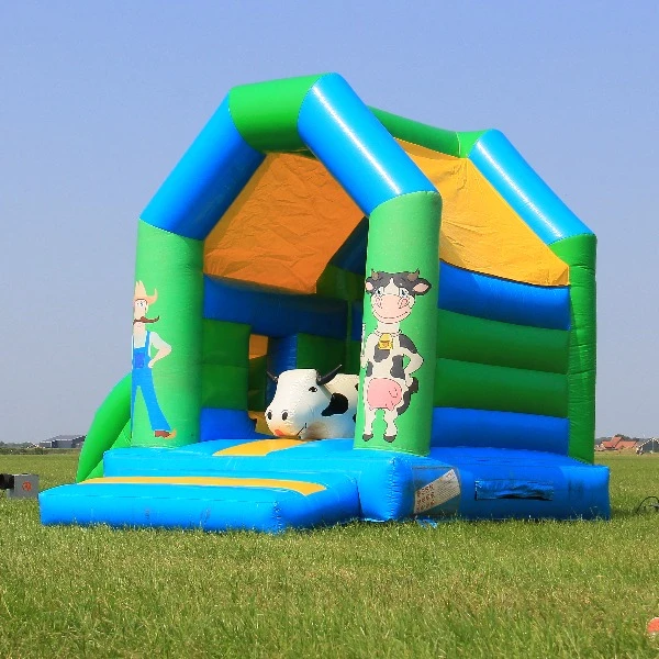 Het springkussen boerderij met glijbaan. Een geweldig springkussen met meerdere speelelementen! Zo kunnen de kinderen spelen op de koe in het midden van het springkussen of glijden van de kleine glijbaan. Het springkussen boerderij heeft een compact formaat. Met een lengte van drie meter en een breedte van drie meter, haal je veel speelplezier in huis, maar lever je weinig in op de ruimte. Ideaal dus ook voor in de meeste tuinen.