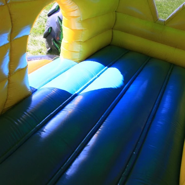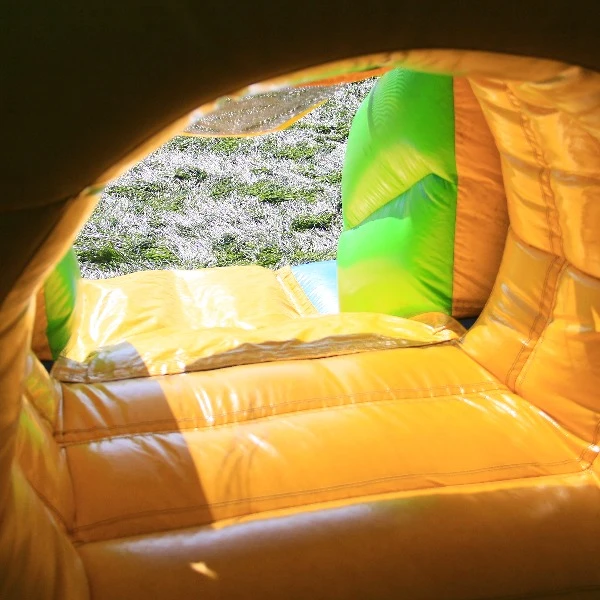 Het springkussen tractor is overdekt net als een echte grote trekker. Het springkussen heeft naast het springoppervlak nog meer te bieden, er zit een glijbaan in die uit het linker achterwiel komt. Hierdoor kunnen tot wel 6 kinderen tegelijkertijd springen en glijden.